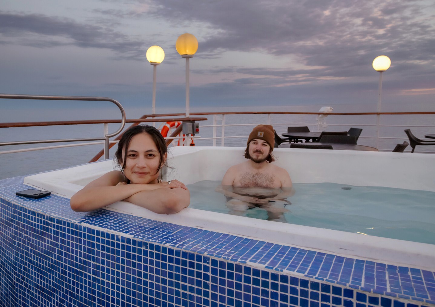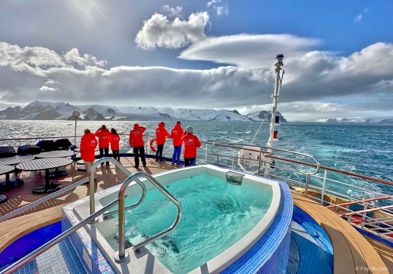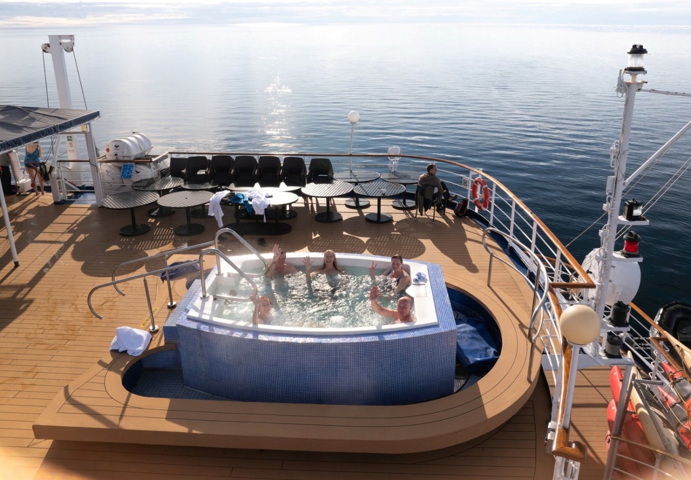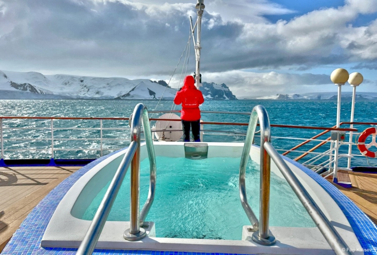 Джакузи на открытой палубе под искрящем небом – просторная гидромассажная ванна с теплой водой, в которой можно расслабиться с видом на океан, айсберги и ледовые пейзажи.Бистро под открытым небом & Открытая палуба