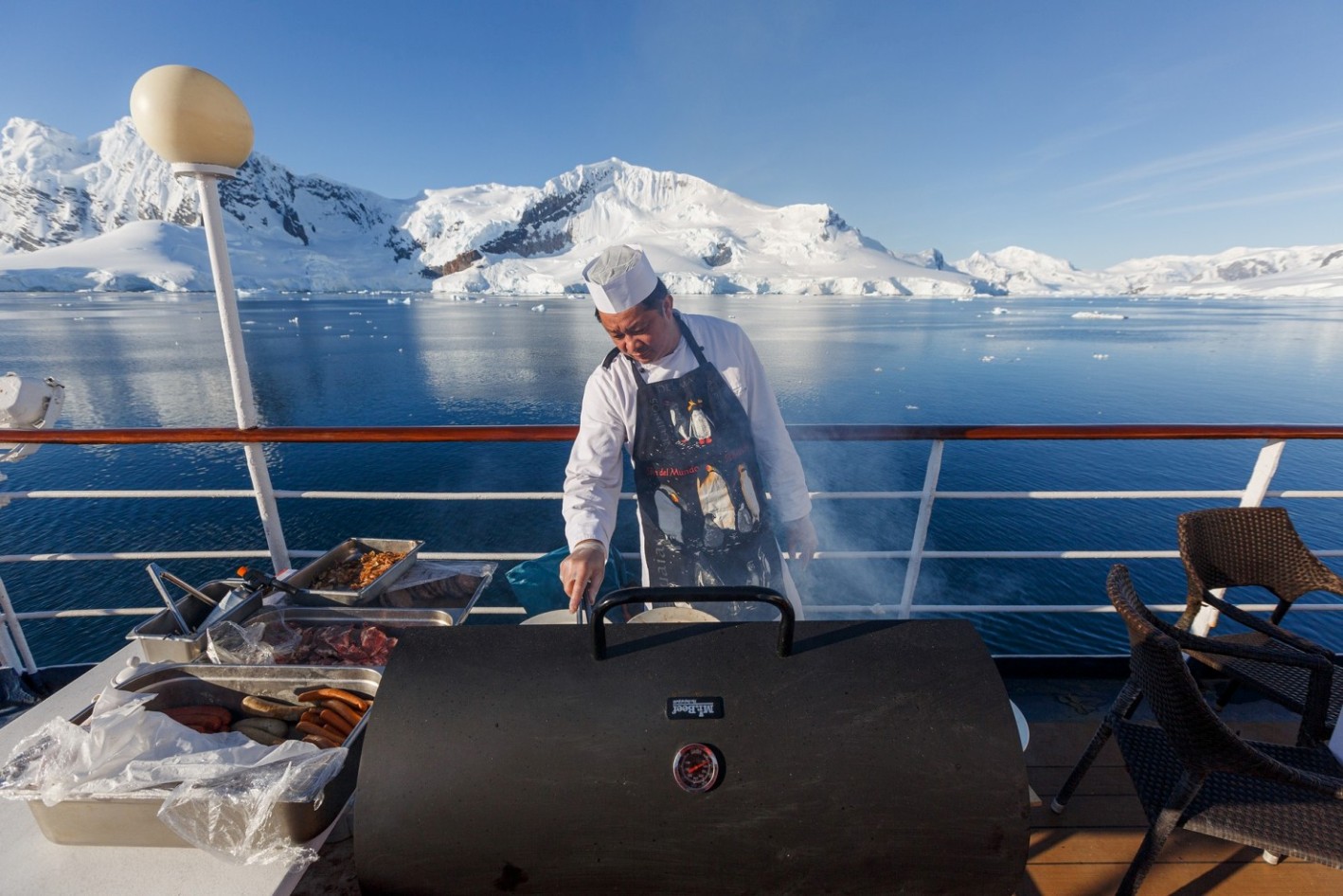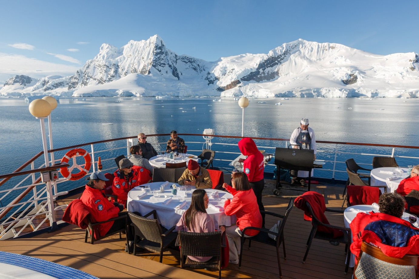 На борту круизного лайнера есть бистро на открытом воздухе, здесь вы сможете любоваться пейзажами ледовых просторов и огромных айсбергов наслаждаясь блюдами на угле.