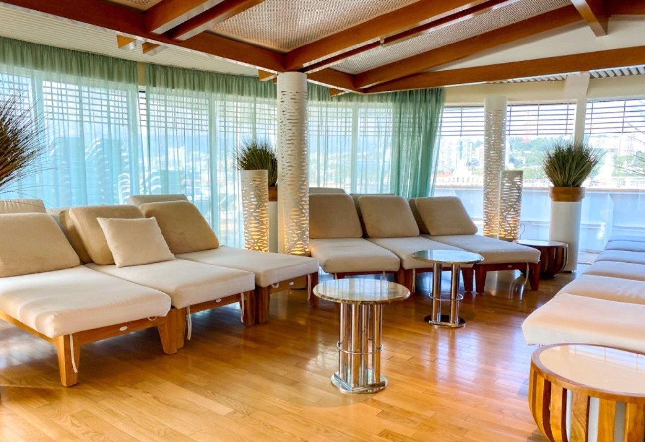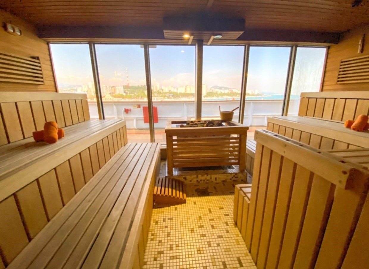 Сауна: лучше заранее забронировать желаемое время посещения сауны, это возможно сделать у администратора на ресепшен. Обратите внимание, что самое востребованное время посещения сауны на лайнерах с 20.00 до 23.00. В сауне есть, душ и парилка, небольшая прихожая с приготовленными полотенцами и простынями. Рекомендуется взять с собой индивидуальные гигиенические мыльные принадлежности и напитки. За 15 минут до начала забронированного сеанса вам предстоит подойти к стойке администратора, и пройти небольшой инструктаж. Парилка как правило к вашему приходу уже будет довольно основательно нагрета!