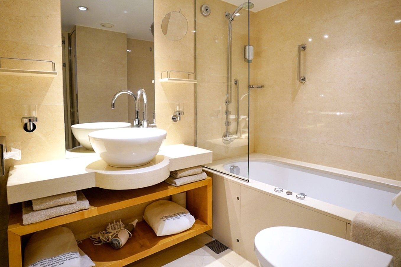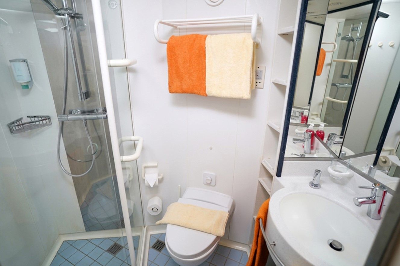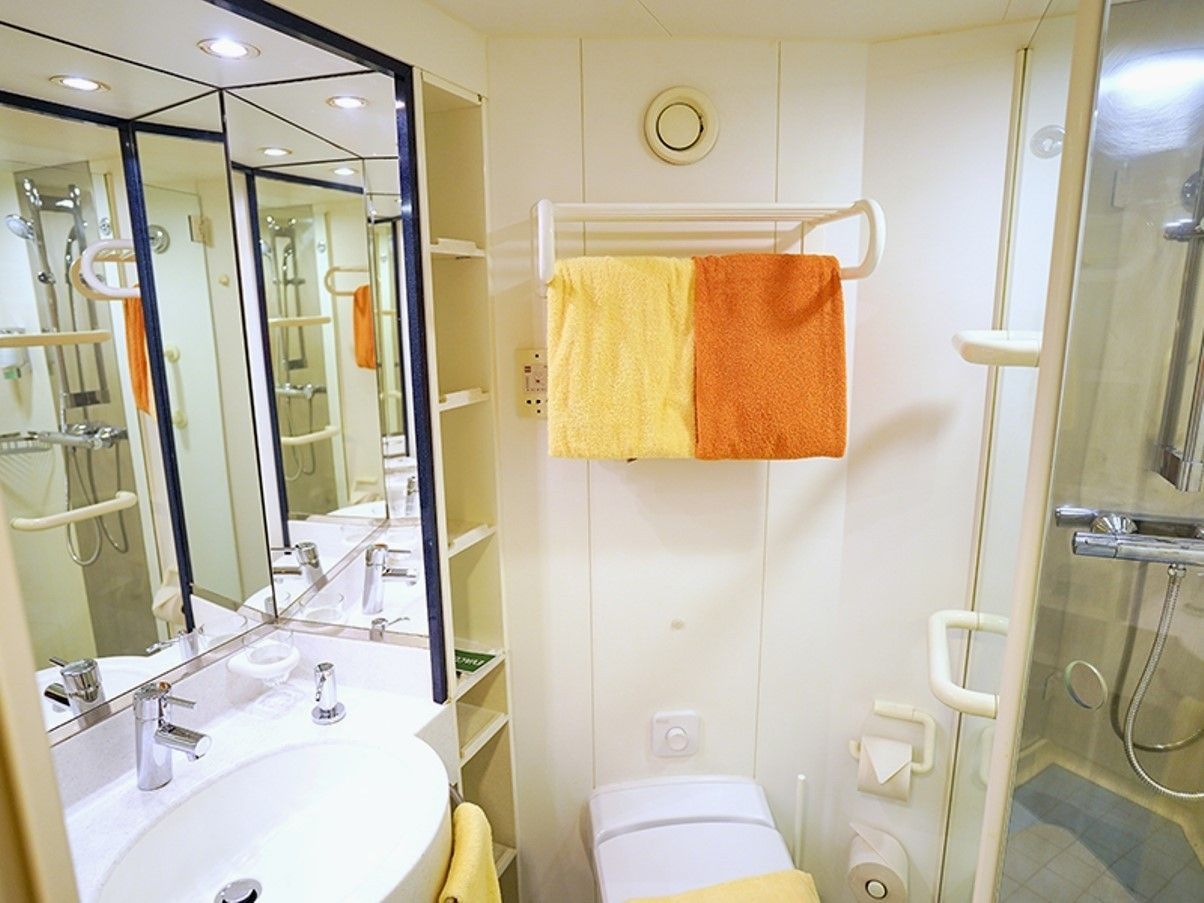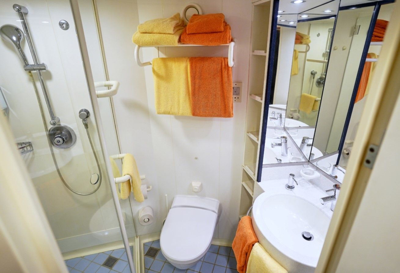 В каютах оборудован санузел увеличенной площади в соответствии со всеми международными стандартами и с учетом потребностей пассажиров. Предусмотрены различные элементы, обеспечивающие комфортное проживание на борту: поручни, нескользкое покрытие на палубе, удобные двери и пр.