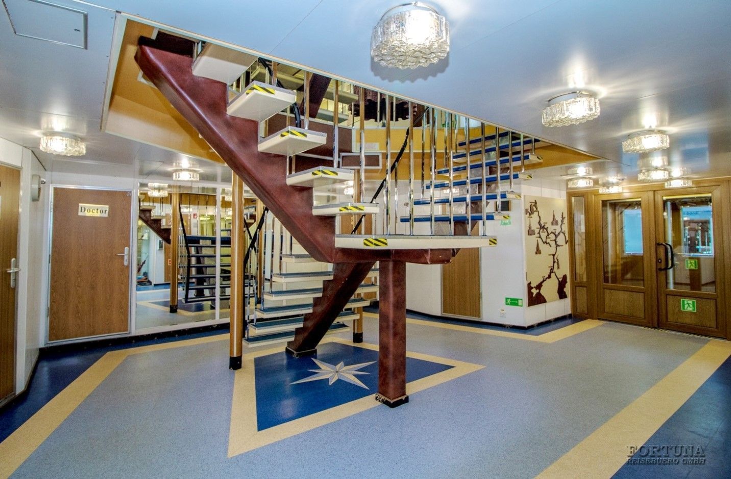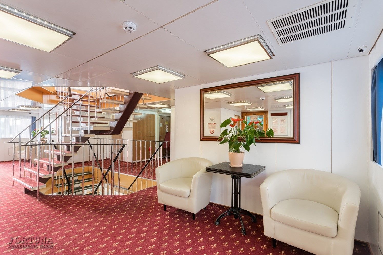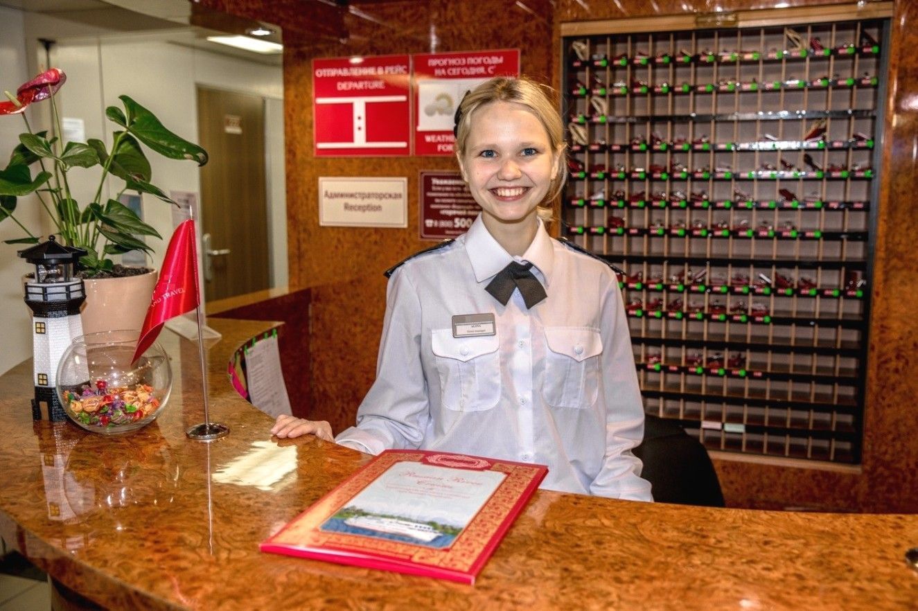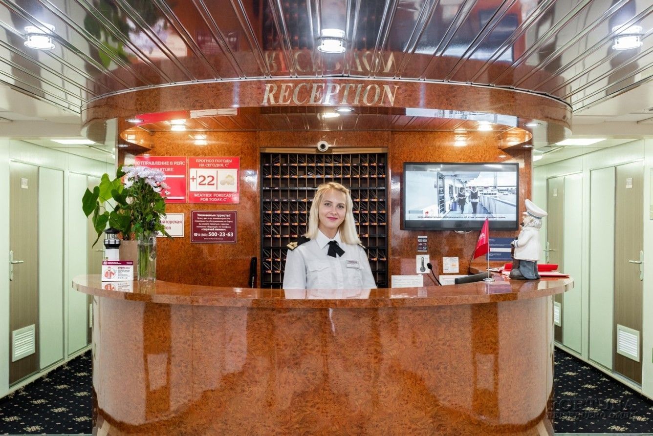 Для ресепшен на борту данного комфортабельного теплохода имеется просторный вестибюль со стойкой регистрации, эта административная стойка расположена на главной палубе. Здесь пассажира встречает улыбчивым взглядом администратор, ответственный за прием, размещение, бортовую программу и организацию экскурсий. Во время регистрации вы получите ключи от каюты и «бортовую магнитную карту», а ваш багаж заберут носильщики (матросы теплохода) и доставят к дверям вашей каюты. Информация о маршруте, расписание с заходами в порты и продолжительность стоянок, об экскурсиях и тд. вывешиваются на информационном стенде рядом. Тут же часто представлен стенд экипажа. Если вы боитесь проспать или у вас появятся дополнительные вопросы по круизу, обращайтесь к менеджерам теплохода на стойке регистрации.