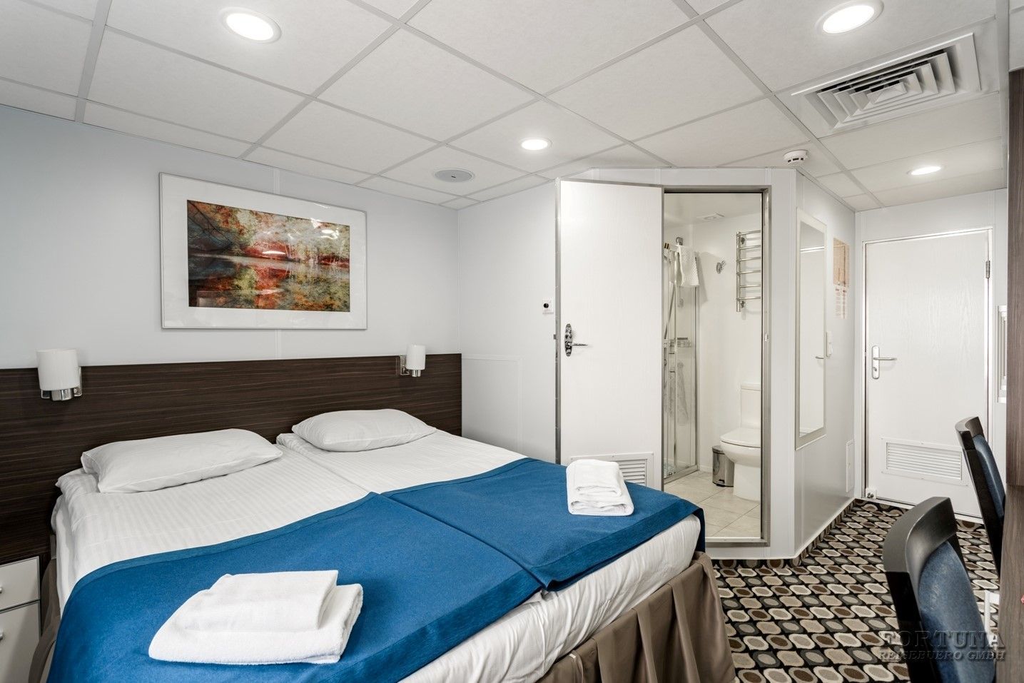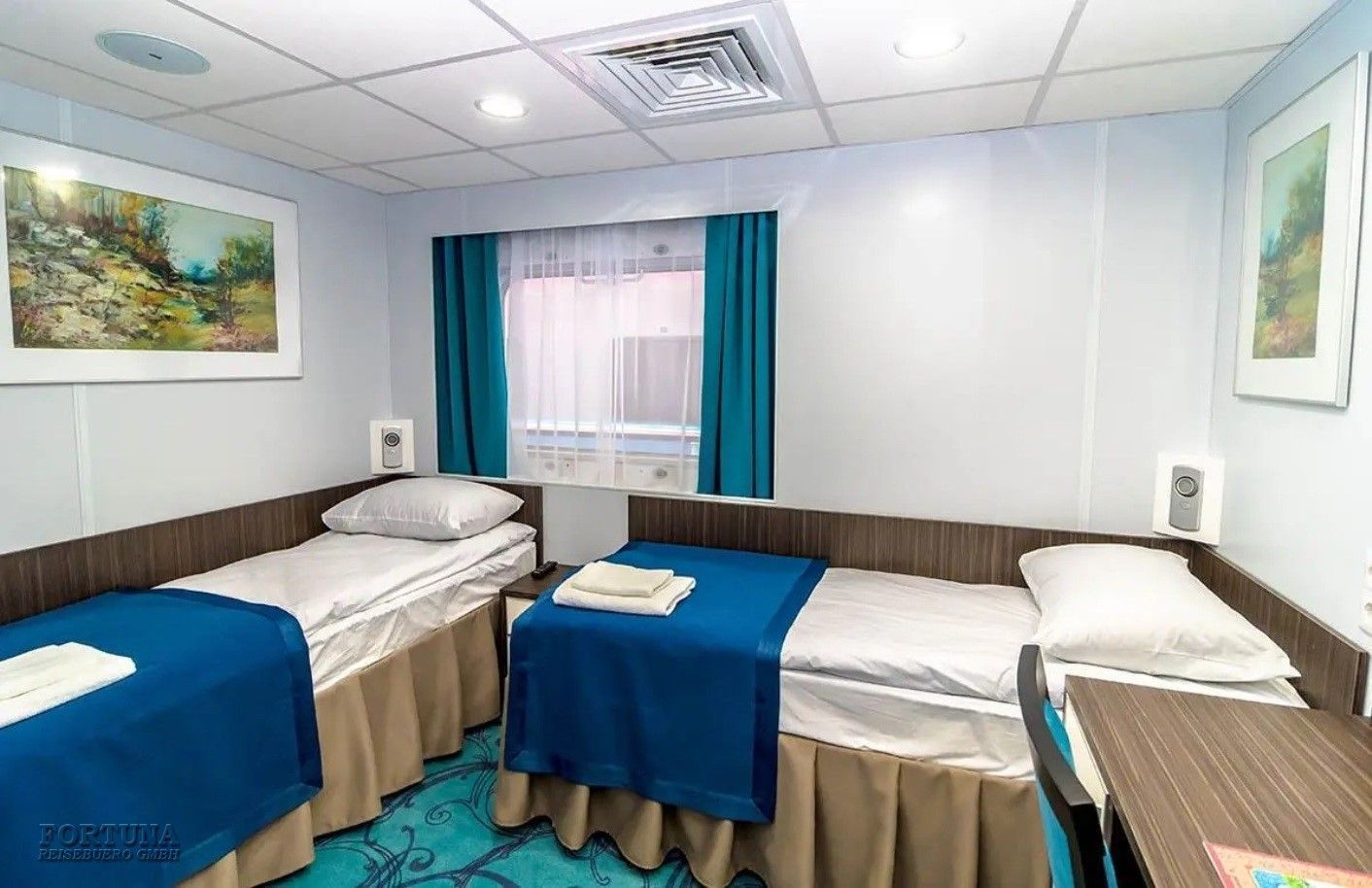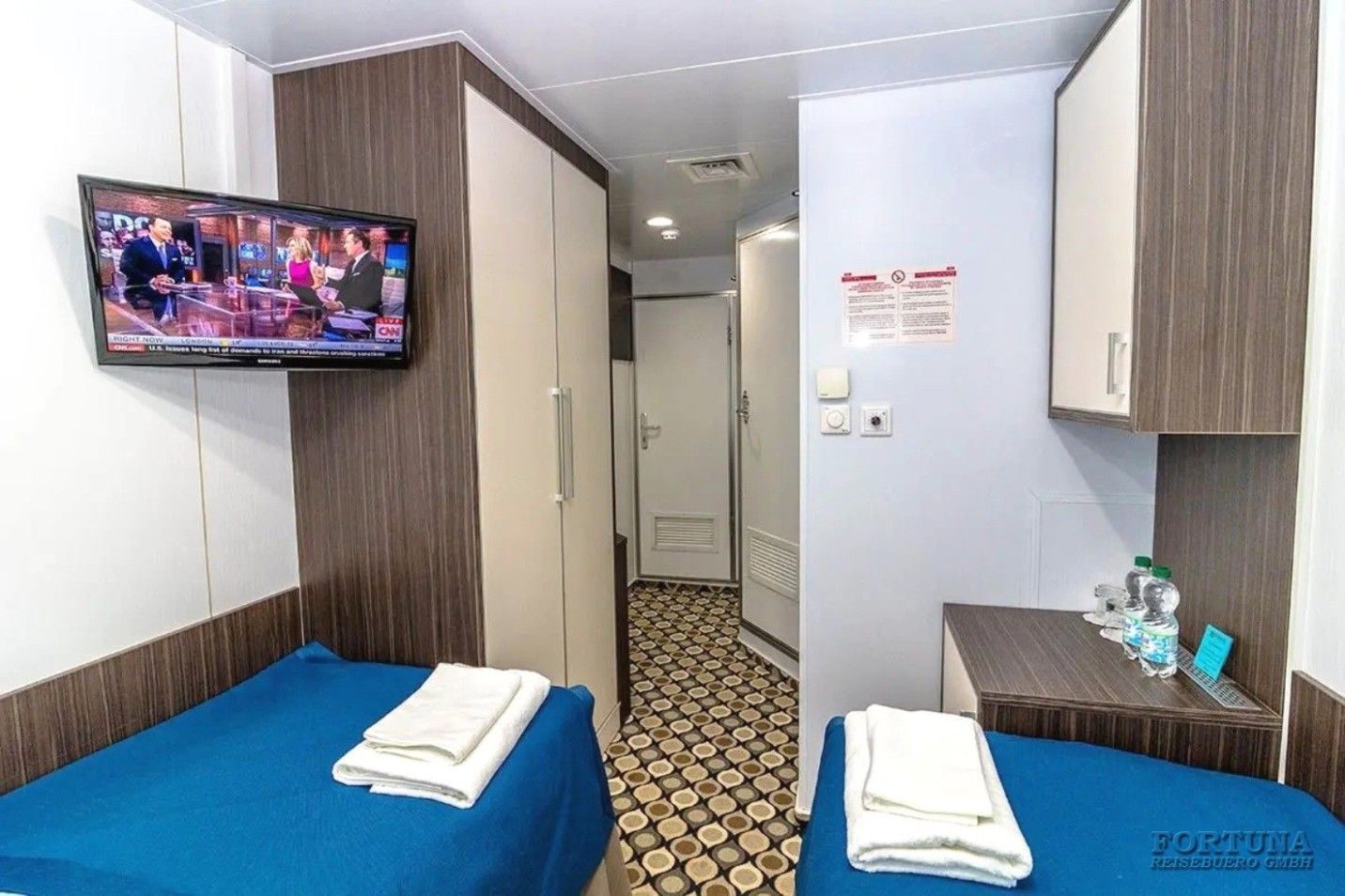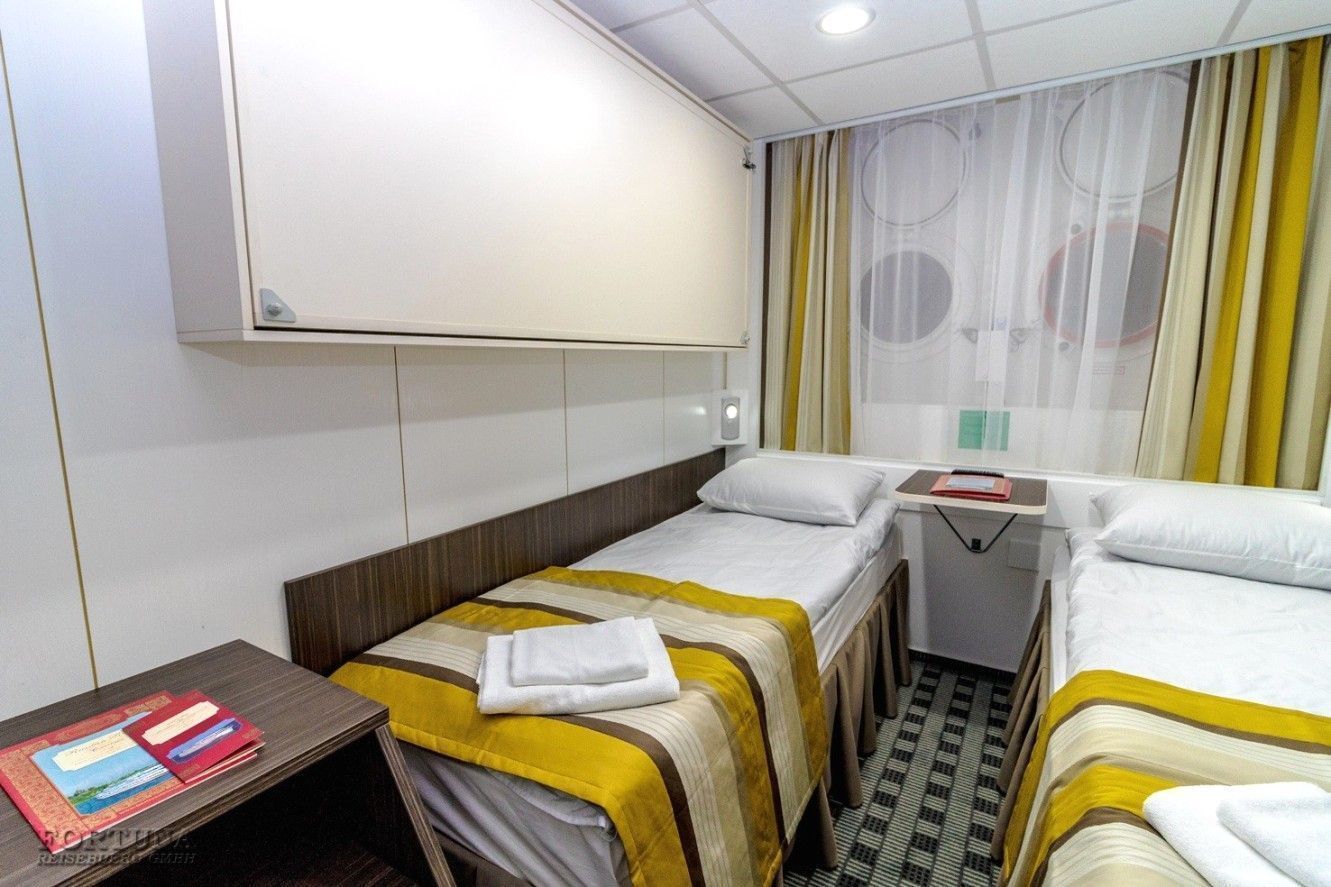 В каютах: одно открывающееся обзорное окно, односпальные кровати, размер кроватей 80х190 см (не сдвигаются), настенные бра, откидной столик, трюмо, платяной шкаф, плазменный телевизор, мини-холодильник, бортовое радио, фен, сейф, электророзетки на 220V.