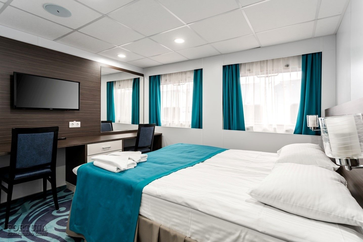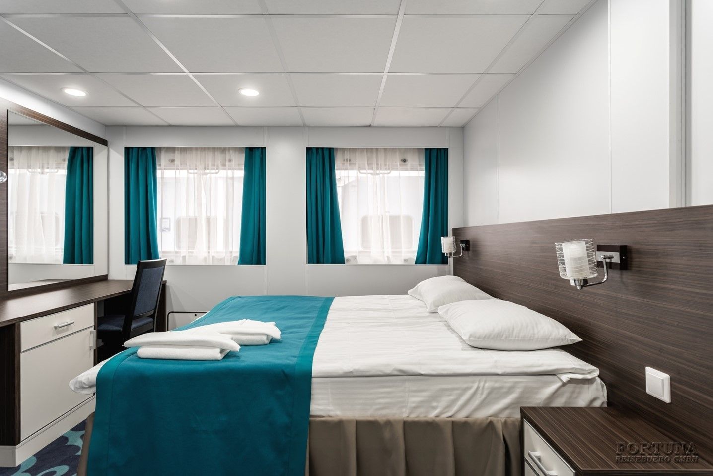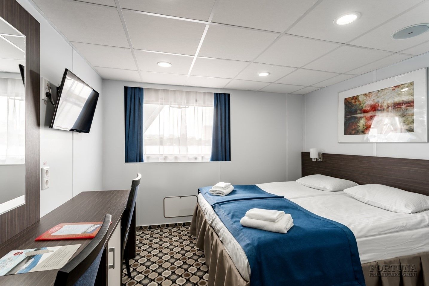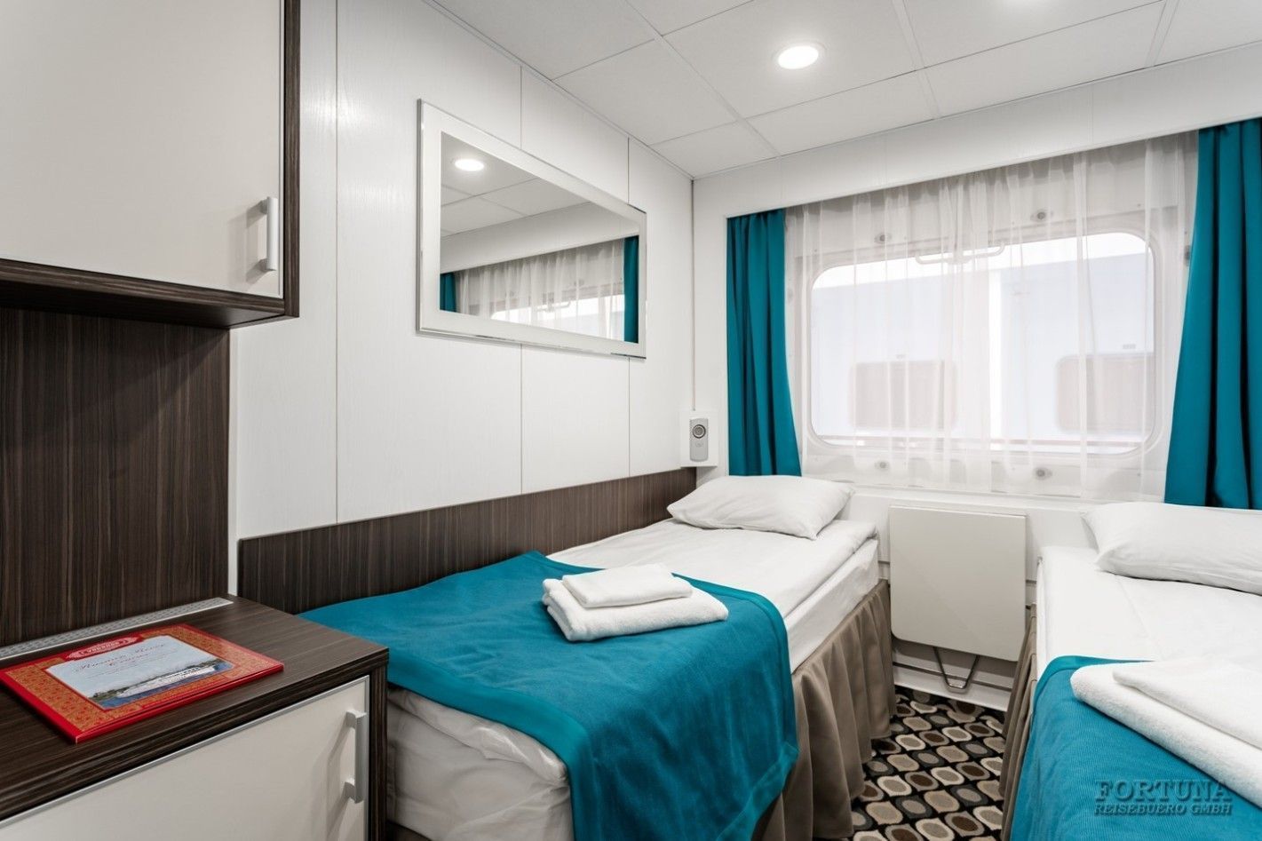 В каютах: одно открывающееся обзорное окно, односпальные кровати, размер кроватей 80х190 см (не сдвигаются), настенные бра, откидной столик, трюмо, платяной шкаф, плазменный телевизор, мини-холодильник, бортовое радио, фен, сейф, электророзетки на 220V.