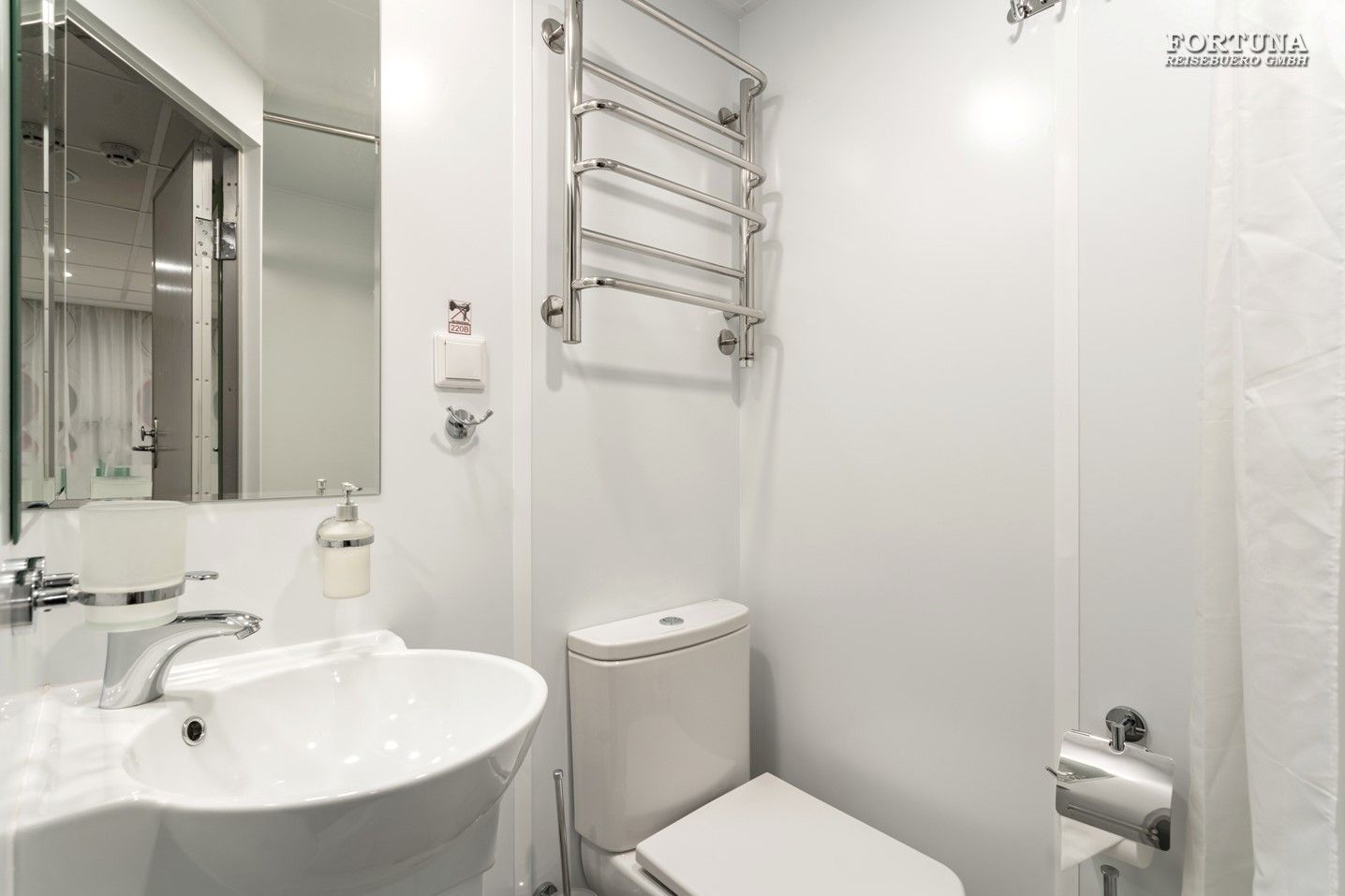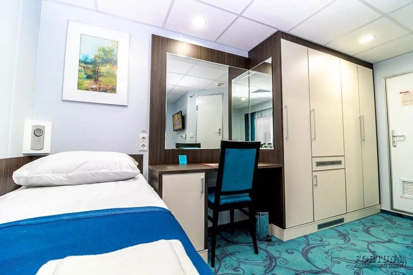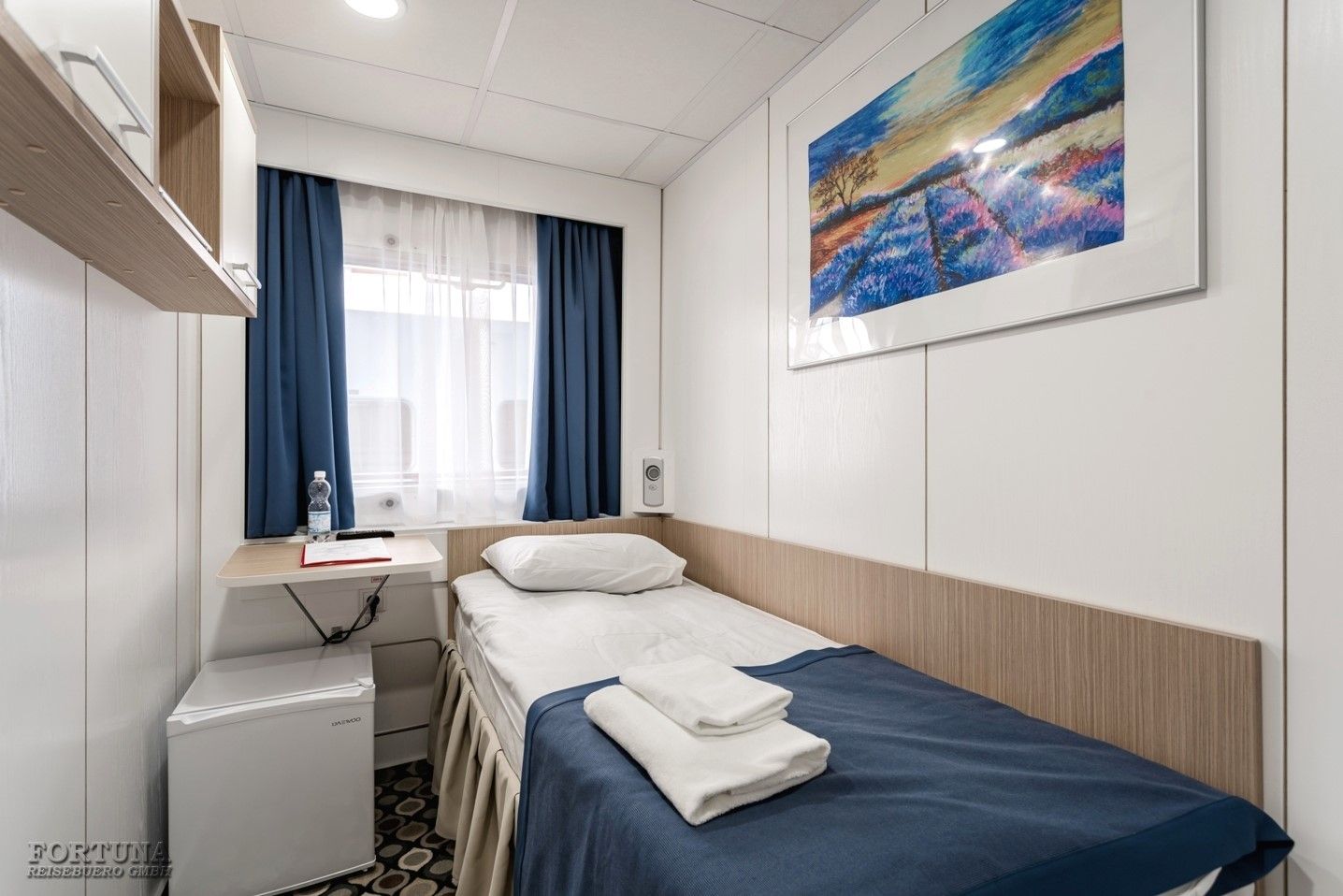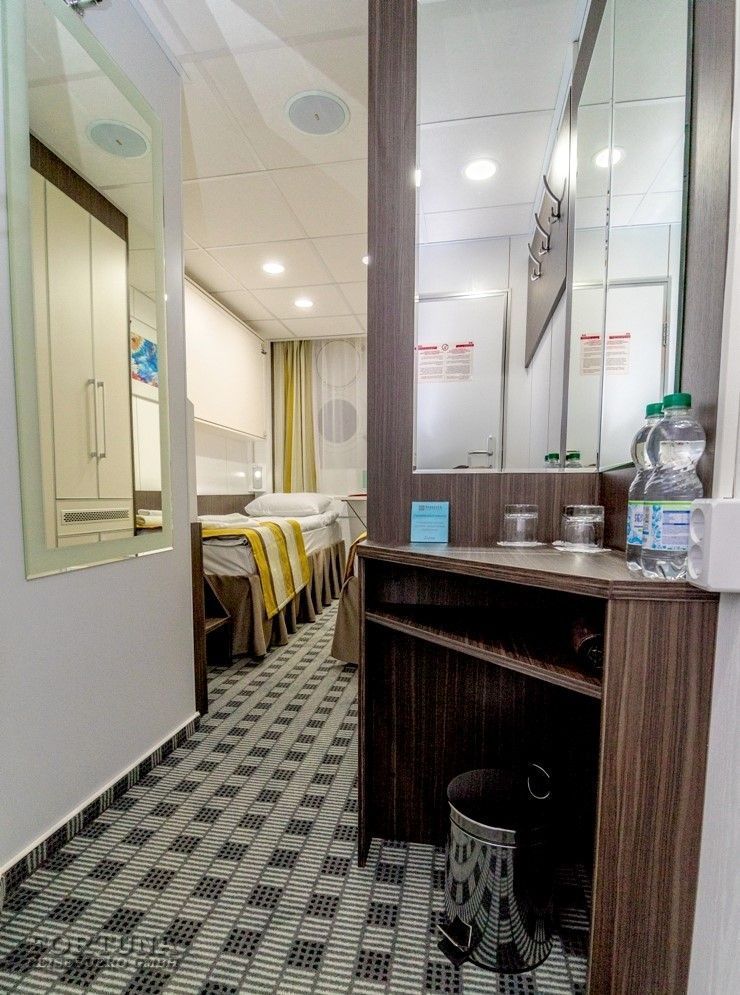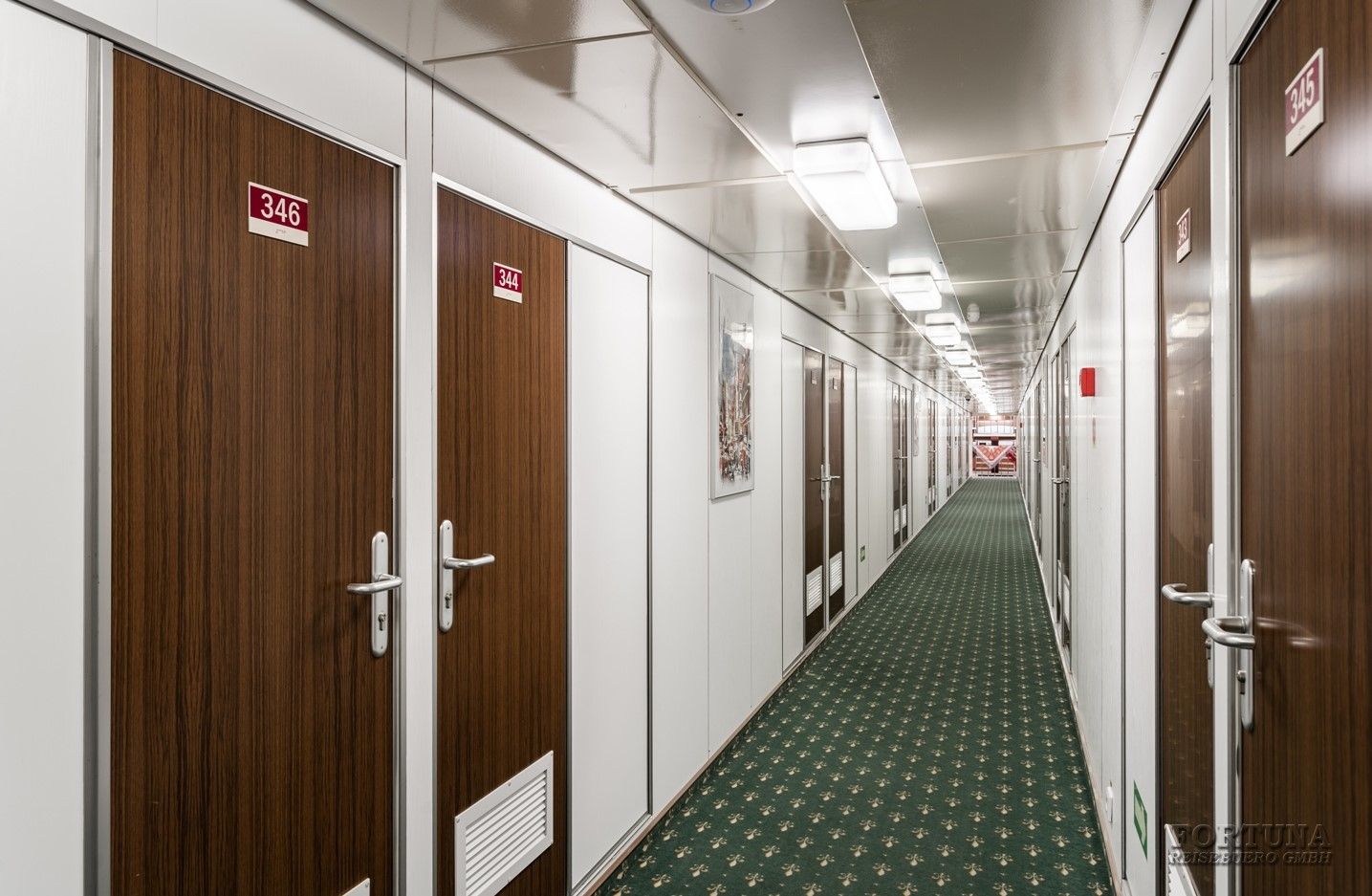 В каютах: одно открывающееся обзорное окно, односпальные кровати, размер кроватей 80х190 см (не сдвигаются), настенные бра, откидной столик, трюмо, платяной шкаф, плазменный телевизор, мини-холодильник, бортовое радио, фен, сейф, электророзетки на 220V.