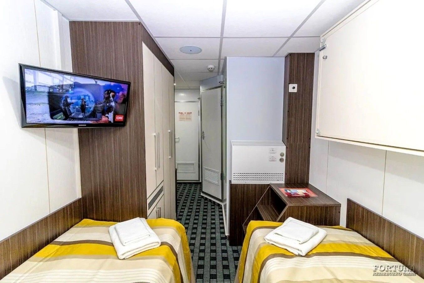 В каютах: два иллюминатора, односпальные кровати, размер кроватей 80х190 см (не сдвигаются), настенные бра, откидной столик, угловой пинал в прихожей, платяной шкаф, плазменный телевизор, мини-холодильник, бортовое радио, фен, сейф, электророзетки на 220V.