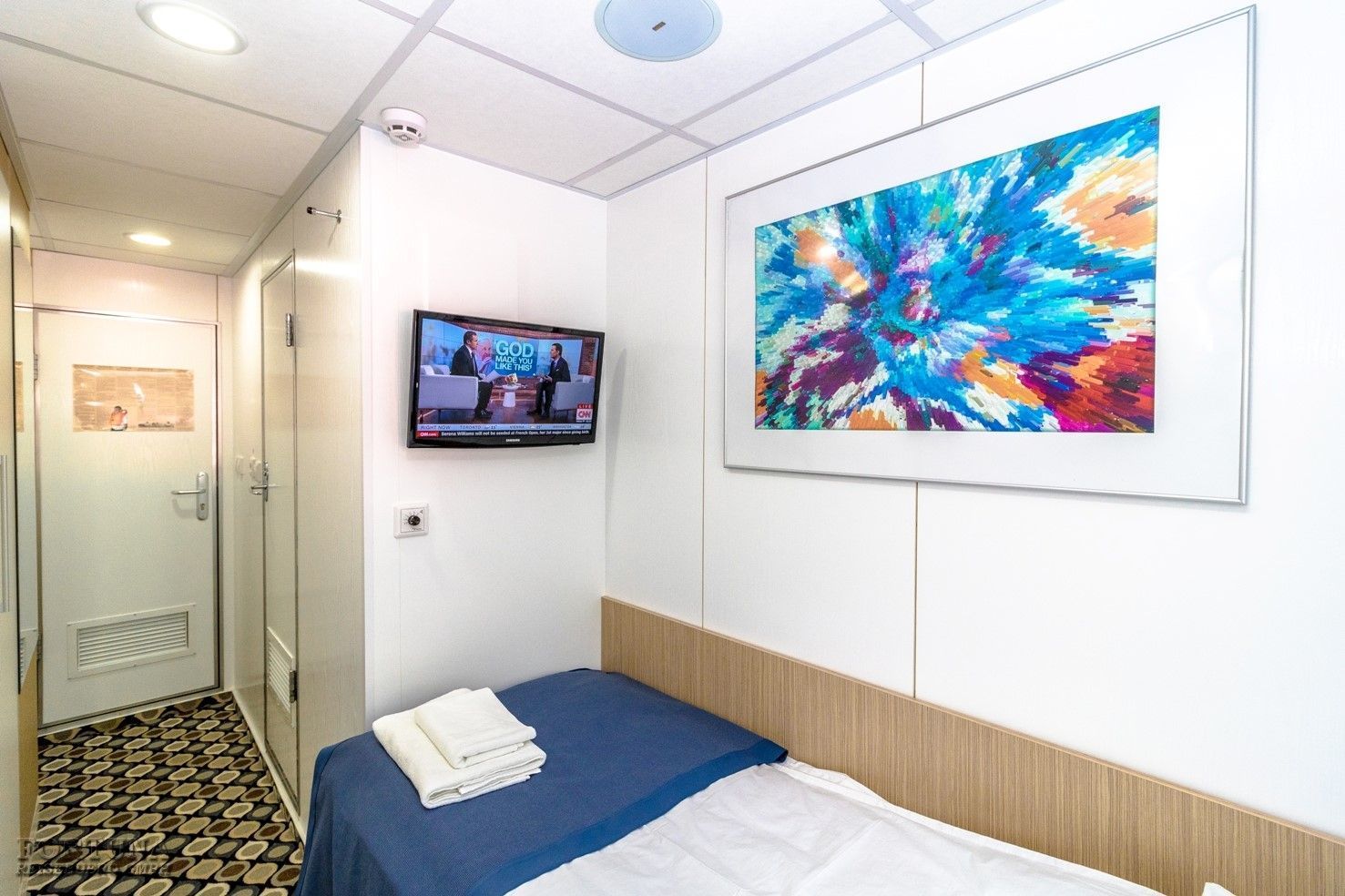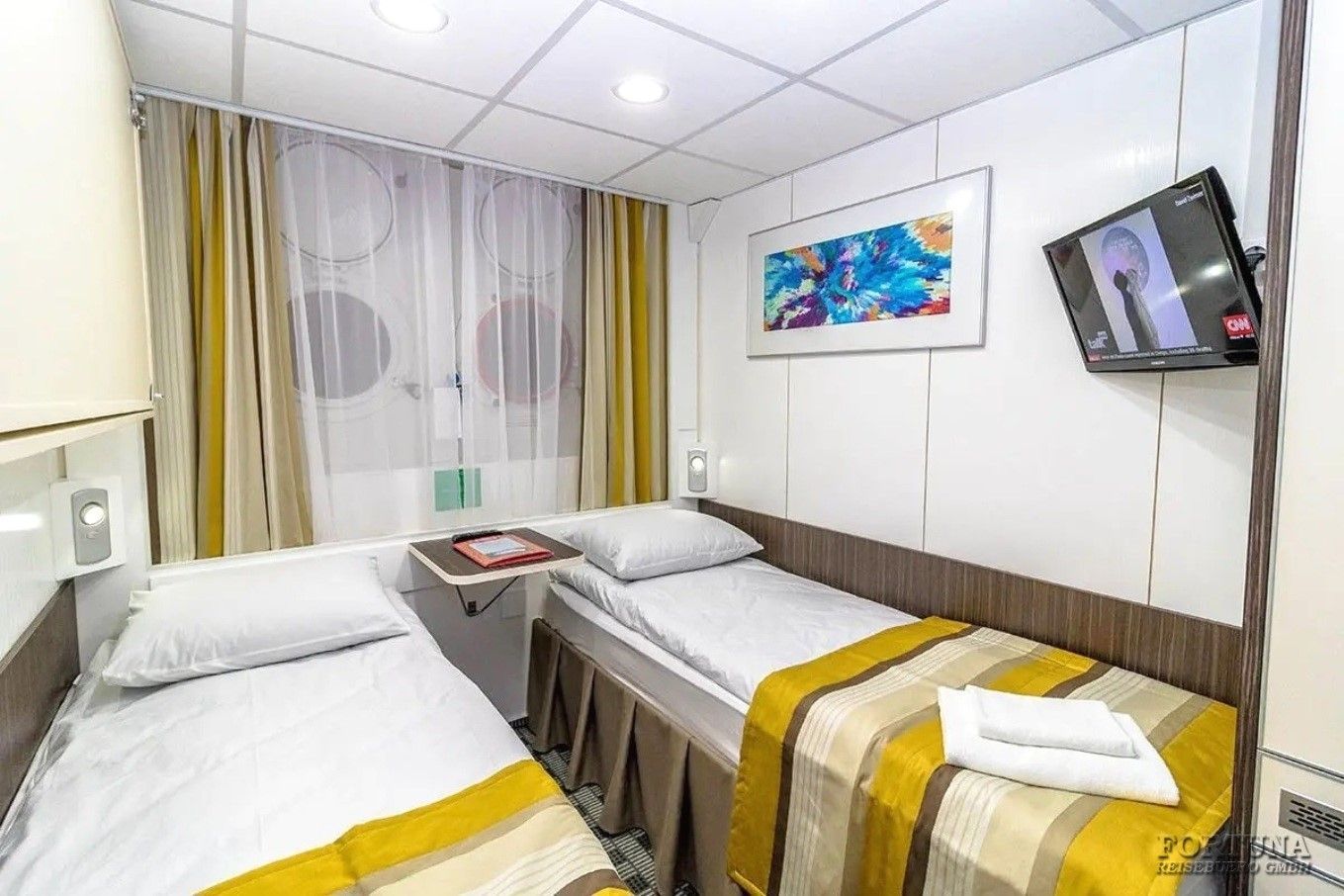 В каютах: одно открывающееся обзорное окно, односпальные кровати, размер кроватей 80х190 см, настенные бра, откидной столик, настенные полки, платяной шкаф, плазменный телевизор, мини-холодильник, бортовое радио, фен, сейф, электророзетки на 220V.