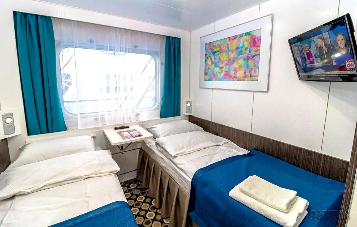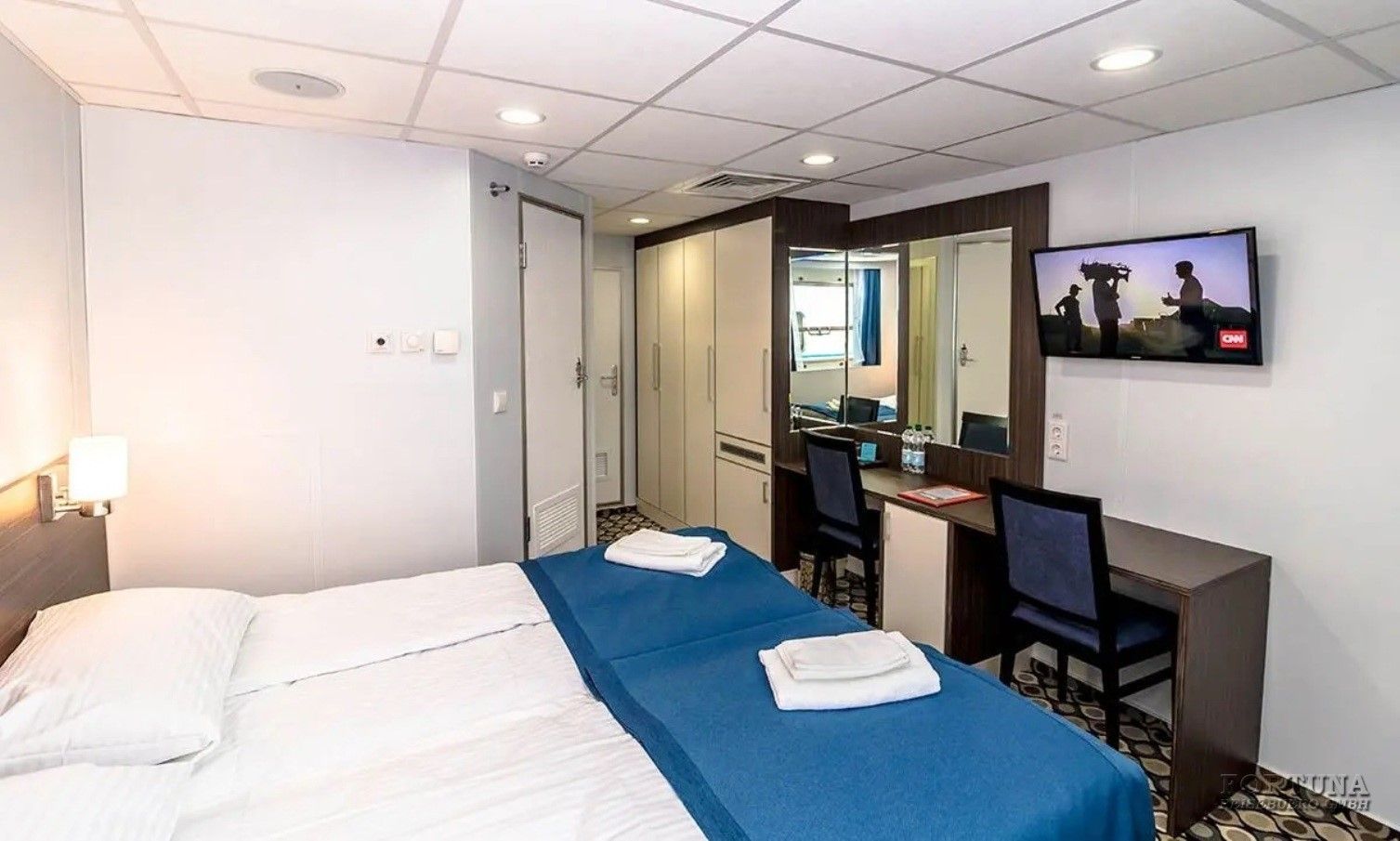 В каюте: две односпальные кровати и одно спальное место верхнего расположения, ванная комната (раковина, душ, туалет), шкаф для одежды, трюмо, радио, телевизор, фен, холодильник, сейф, кондиционер, розетка 220V, иллюминаторы.