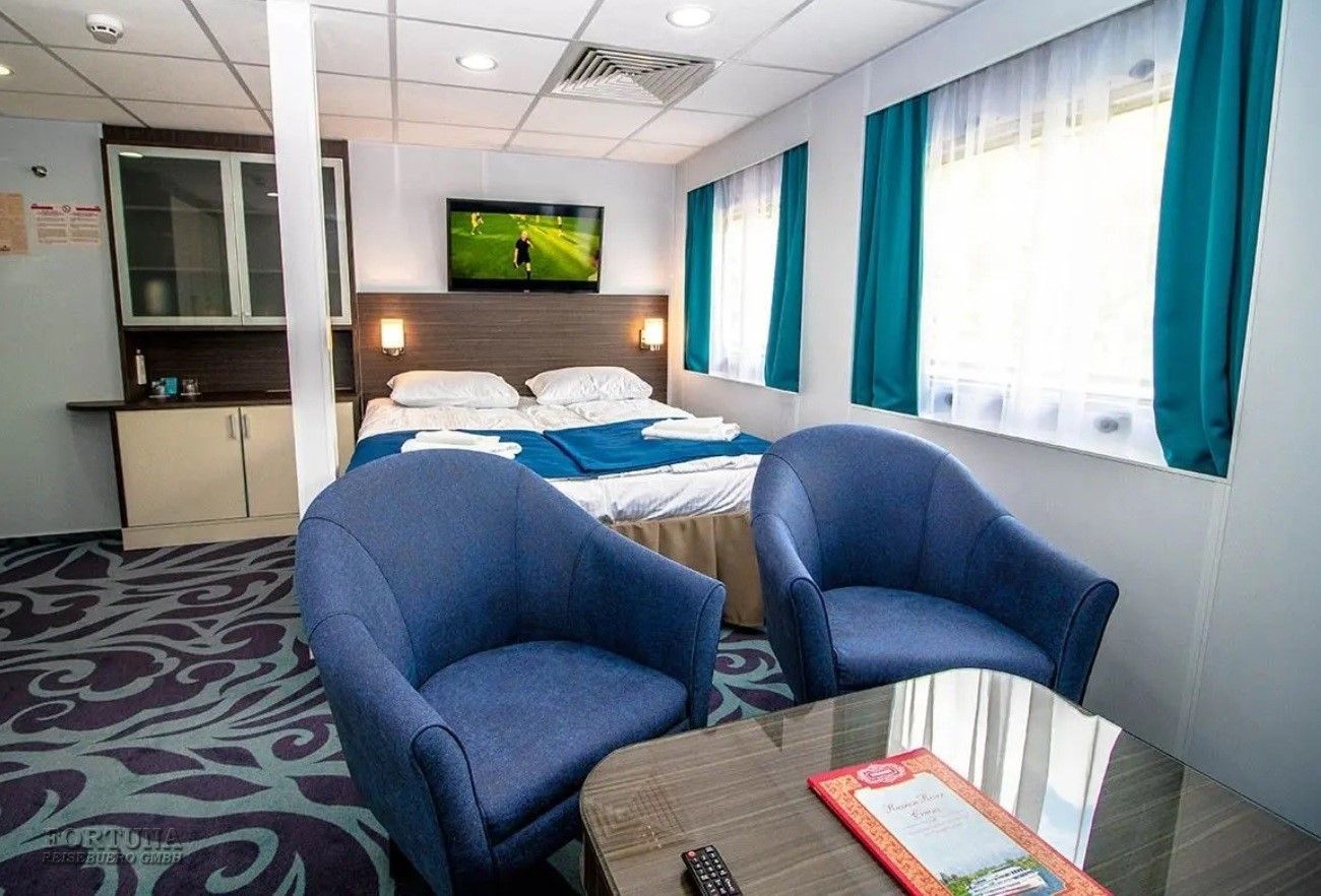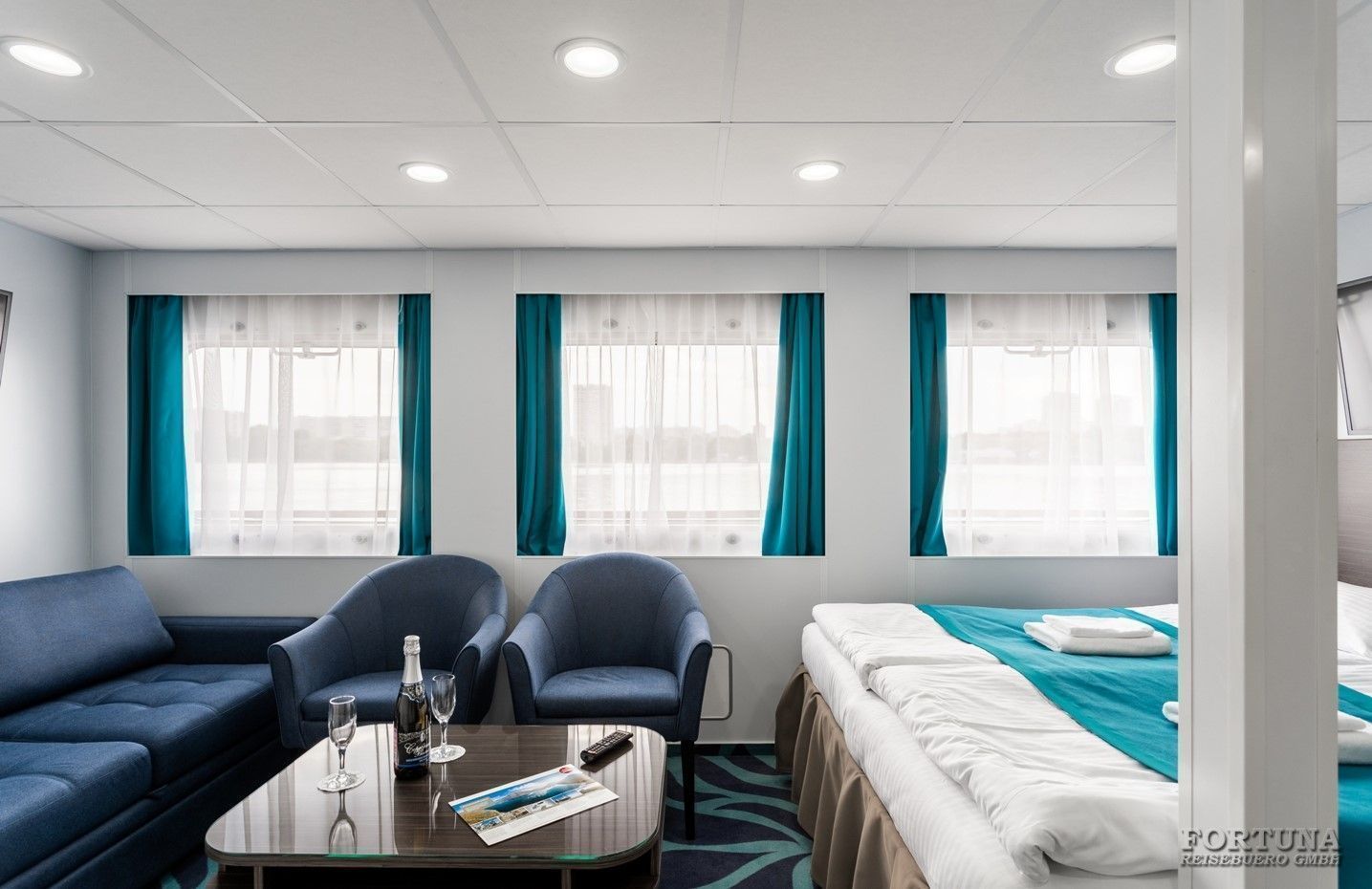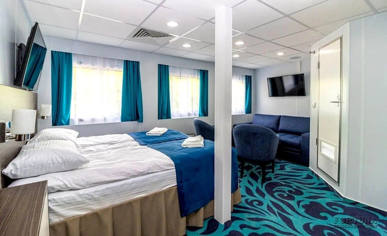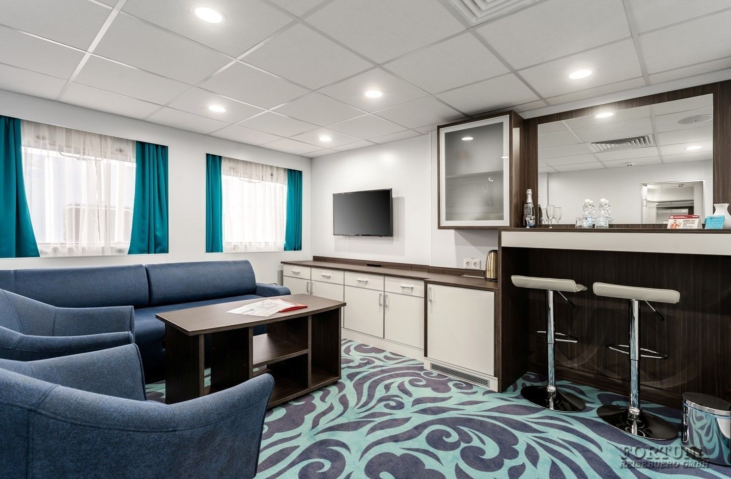 В каютах: три открывающихся обзорных окна, двуспальная кровать (размер кроватей 160х190 см.), настенные бра, прикроватные тумбы, диван (140х150 см) и два кресла, журнальный столик, платяной шкаф, плазменный телевизор, мини-холодильник, бортовое радио, фен, сейф, электророзетки на 220V.
