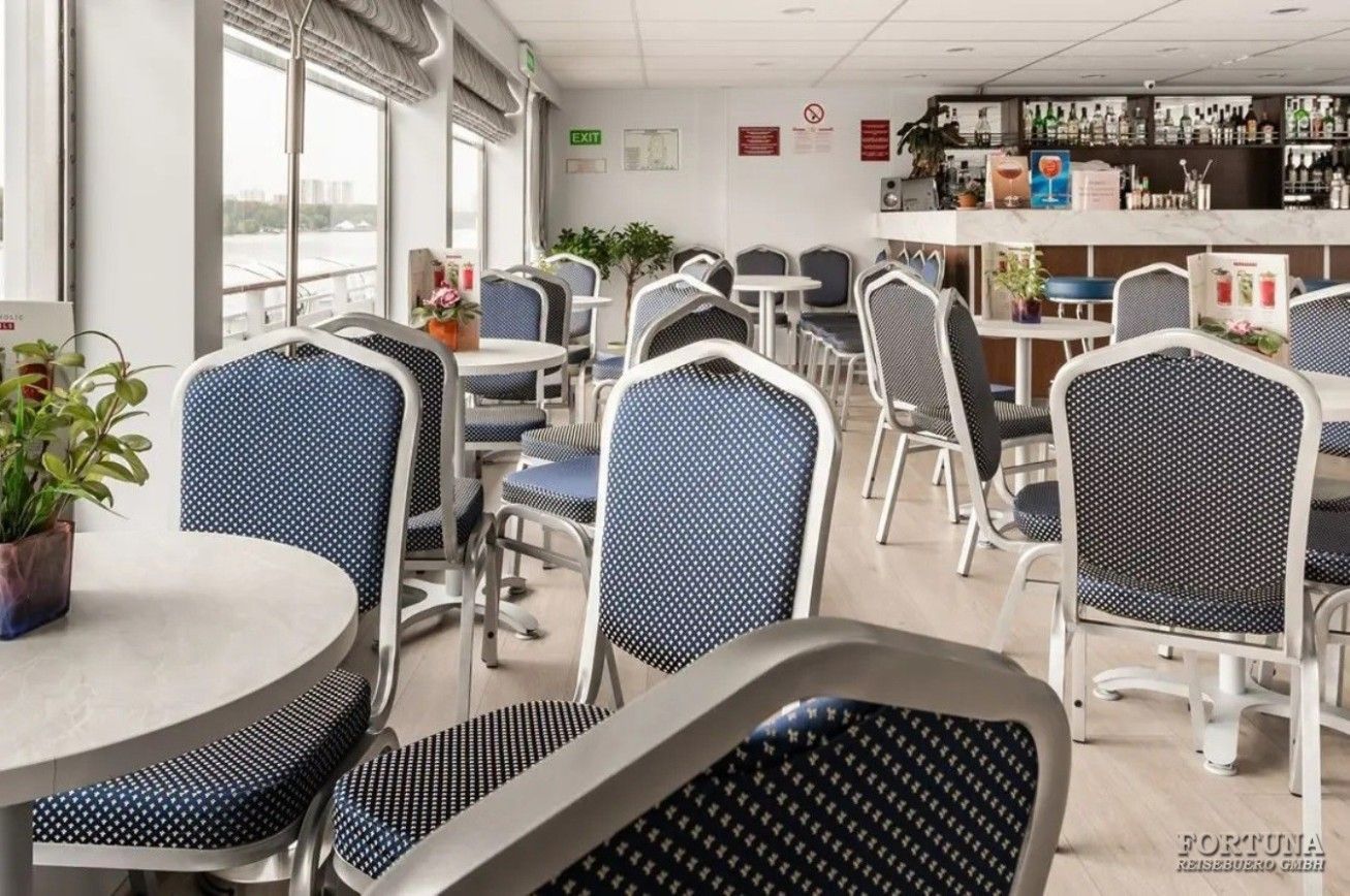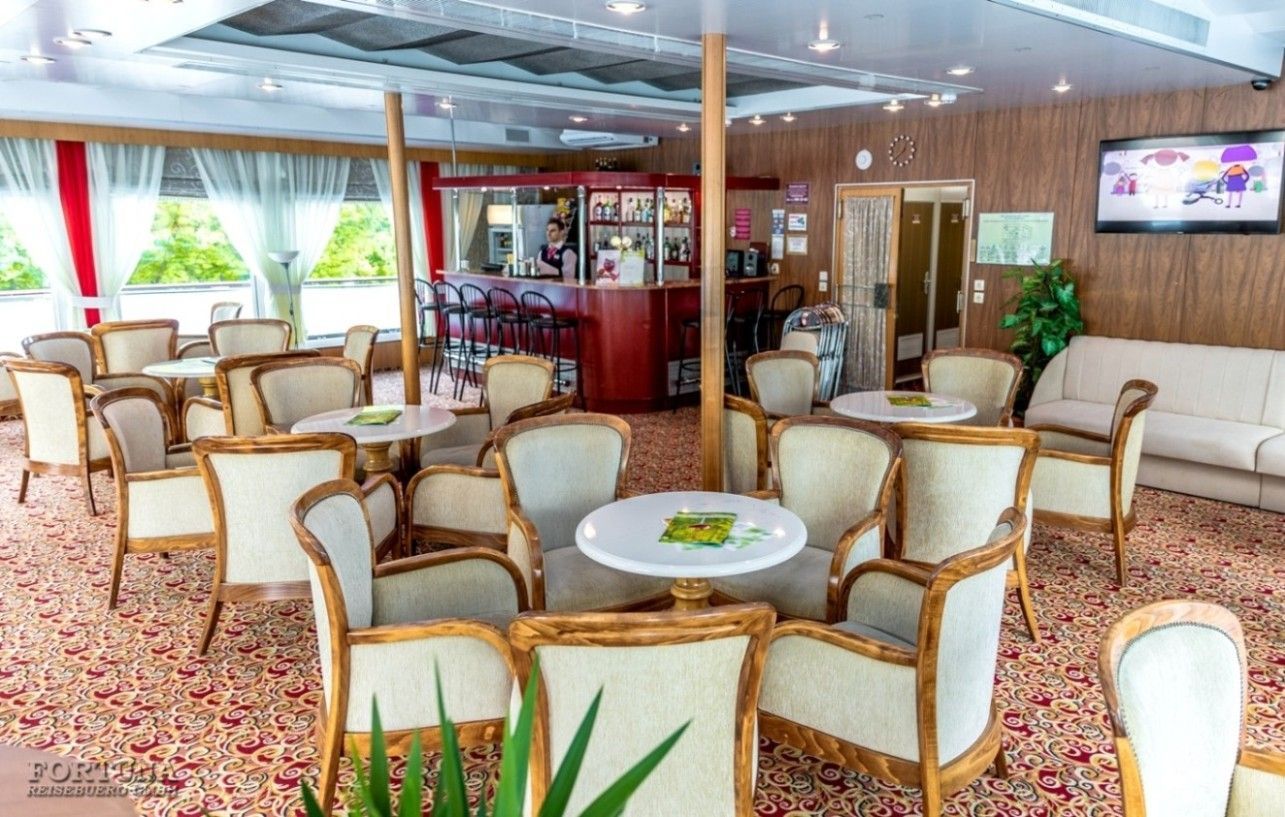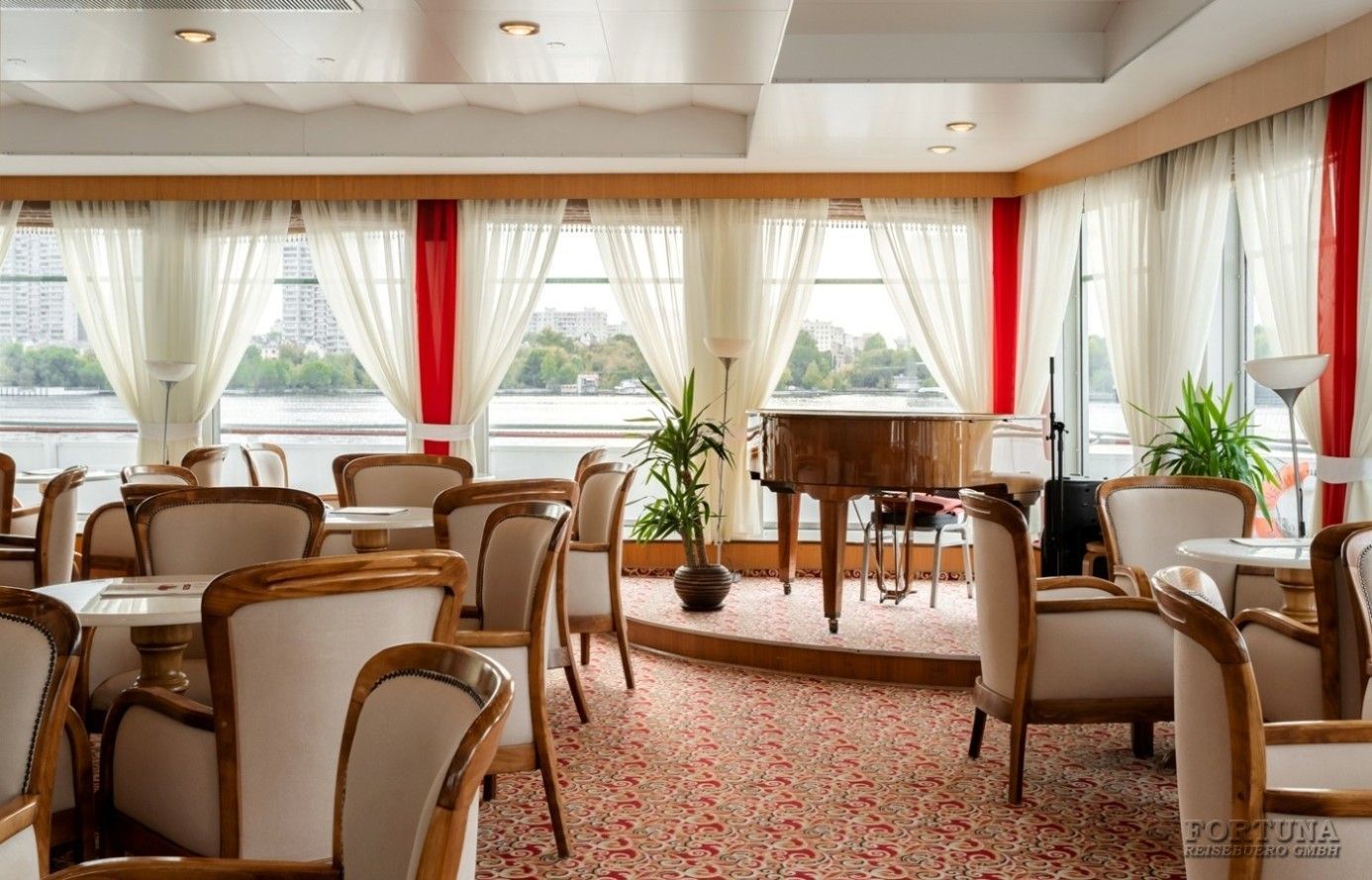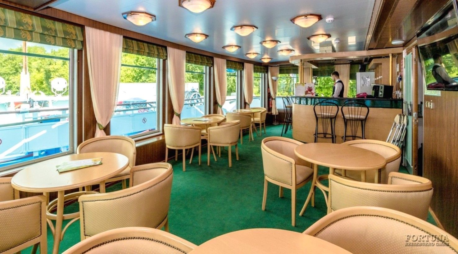 Музыкальный салон-бар теплохода – место встречи пассажиров. Отсюда открываются замечательные виды на проплывающие мимо речные пейзажи, большие панорамные окна легко создают круизную атмосферу. Здесь подается прекрасный кофе, крафтовое пиво российских и зарубежных пивоварен и играет музыка! Живая музыка! Здесь в вечернее время пассажиры могут насладиться живым исполнением музыкальных произведений, потанцевать или принять участие в вечерних программах.