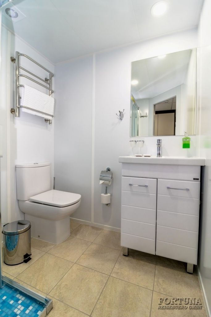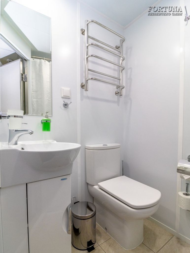 Душ & WC – расширенная площадь отдельного санузла: зеркало, полка, крючки для полотенец, мусорное ведро, раковина, туалет и душевое отделение. Туалетные принадлежности (шампунь, гель для душа, мыло) пополняются ежедневно, а также смена полотенец по требованию.