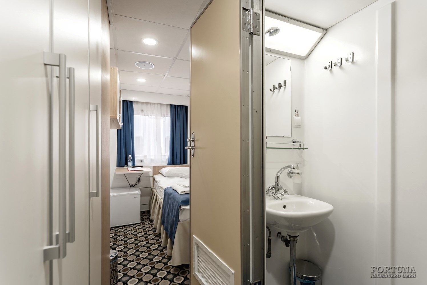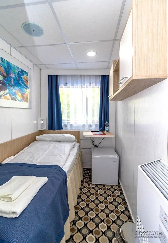 В каютах № 201-224 главная палуба и № 301-306 средняя палуба — две односпальные кровати размером 80х190 см, площадь кают ~13,2 м²Каюты Одноместные
